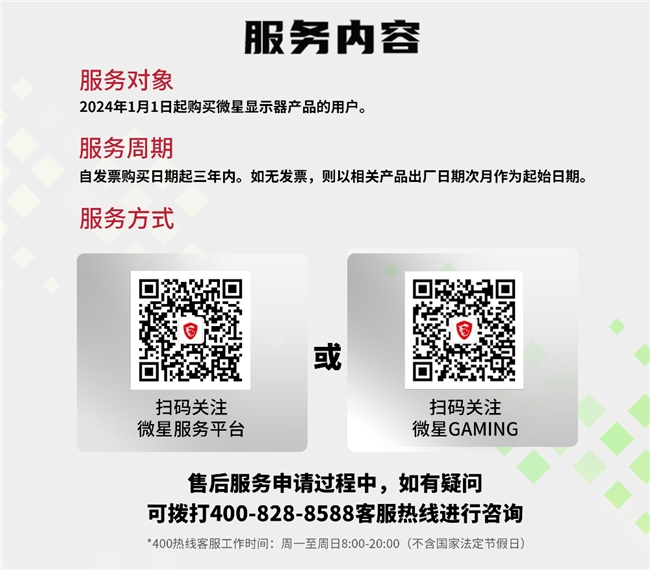 1. 一键报修:用户若遇显示器问题,仅需通过公众号“微星GAMING”或“微星服务平台”扫码报修。