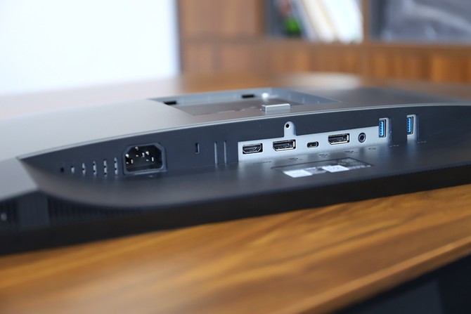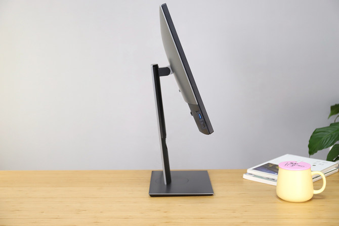 显示器背面上部是银色,与转轴处的方形、内圆设计相得益彰,简洁商务风格。通过转轴处,你可以将显示器调节到适合自己的角度,无论是倾斜还是竖屏,都能满足你的需求。下部的黑色区域是接口区,除了在底部的接口,还在正面、左侧边框处设计了快捷接口。