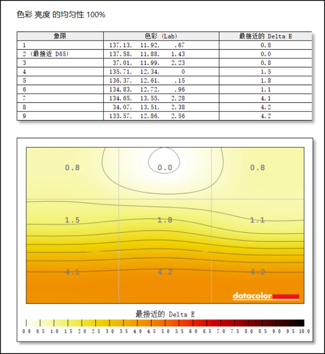 在色彩均匀性的测试中,可以看出显示器的中上区域最接近D65的标准,上、下区域的色彩均匀呈现过渡性,与标准色温最大差距数值4.2,该数值在3.2~6.5之间时,只有经过专业训练的人士可以辨別其不同,大多普通人是观察不到其中的差异的,达到专业级显示器的标准。