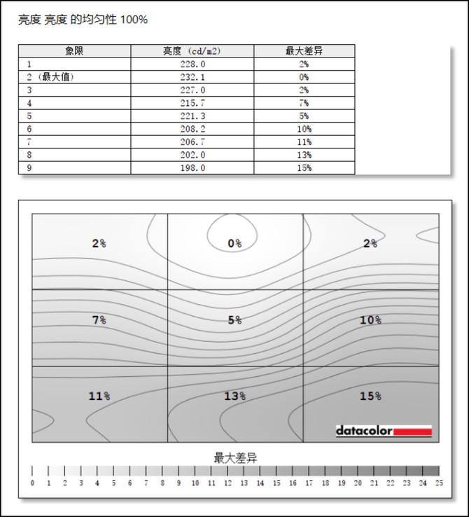 屏幕的亮度均匀性同样跟色彩均匀性一致,呈现上下过渡,亮度均匀性最大差值为15%。