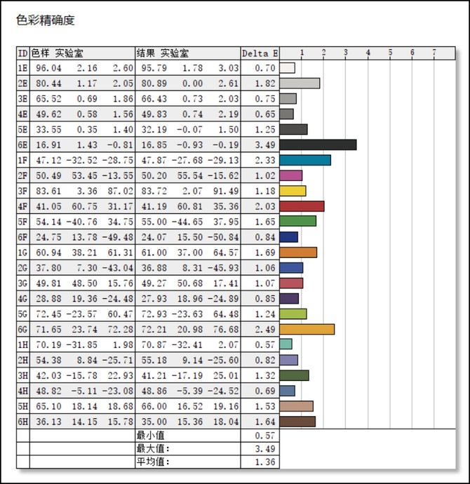 我们利用校色仪对24种颜色在标准光照环境下进行标准测试,如下图所示,柱状图左侧的△E值,反映的是显示器与标准值之间差距的大小,其数值越小越好,分值越高则说明色彩越失真。最终的结果,最大值为3.49,最小值为0.57,平均值为1.36,一般情况下,△E值小于2的显示器能够达到专业级别。