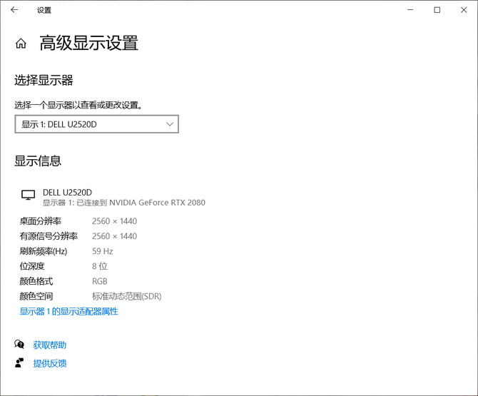 测试的主机搭载英特尔i9-9900k处理器,配备RTX2080独立显卡,以及32GB DDR4内存。数据线采用了随显示器附带的DP连接,在显示设置里可以看到桌面分辨率为2560×1440,屏幕刷新率为59Hz,RGB色彩格式。